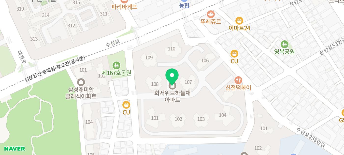 ㆍ세븐일레븐 화서위브점(112m) ㆍCU 화서위브점(118m) ㆍ세븐일레븐 수원정자의료원점(177m) ㆍ이마트24 수원영화점(184m) ㆍCU 수원두견마을점(258m) ㆍGS25 장안수성로점(317m) ㆍ세븐일레븐 수원정자중앙점(392m) ㆍGS25 영화중앙점(420m) ㆍGS25 정자스카이점(460m) ㆍ이마트24 수원병원점(480m)