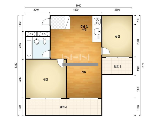 방2, 욕실1, 거실, 주방/식당, 발코니,등