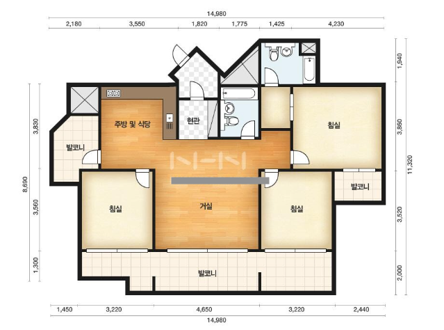 방3, 욕실2, 거실, 주방/식당, 발코니,