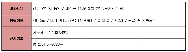 ☆샛별한양 아파트단지 정보☆
