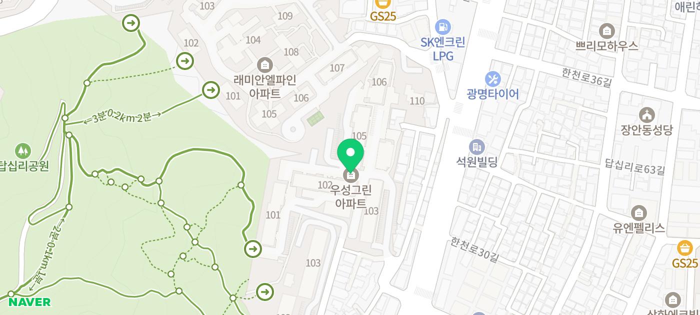 ㆍSK행복충전 복지장안충전소(166m) ㆍ답십리주유소(236m) ㆍ청운주차장(256m) ㆍ힐스포파크 주차장(259m) ㆍ대원빌딩 주차장(270m) ㆍ동대문구체육관 지하주차장(303m) ㆍ평화카센타 주차장(325m) ㆍ지하주차장(339m) ㆍ형제주차장(340m) ㆍ우성아파트3동 주차장(343m)