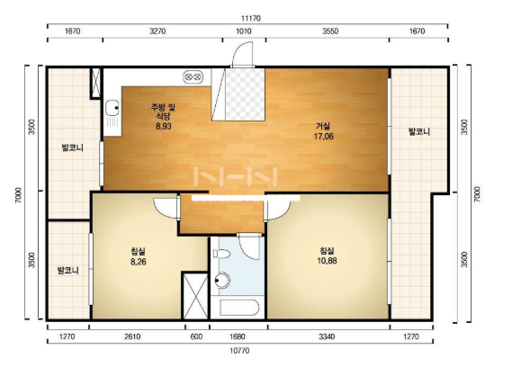 방2, 욕실1, 거실, 주방/식당, 발코니,등