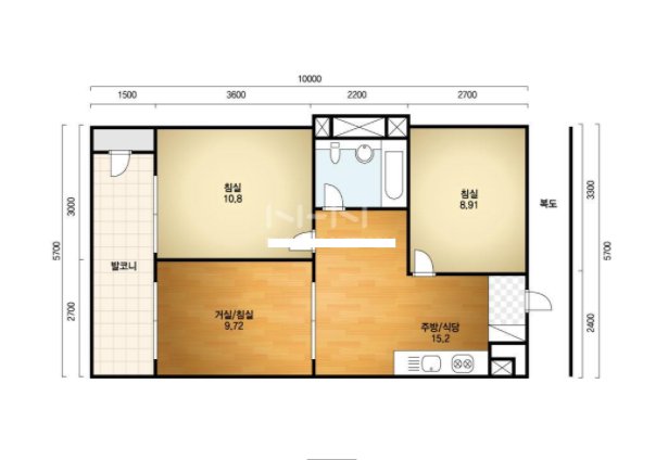 방2, 욕실1, 거실, 주방/식당, 발코니,등